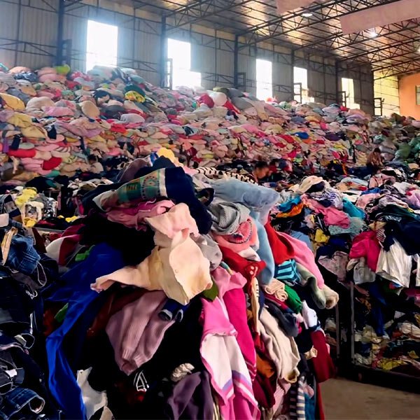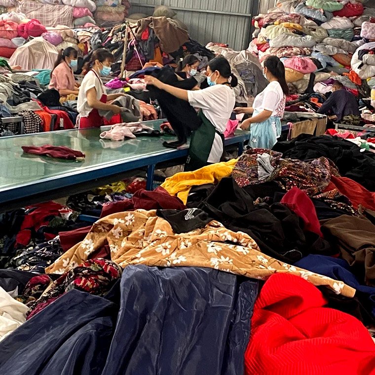 This is a large warehouse storing all kinds of second – hand clothes, and there are also women workers sorting the clothes