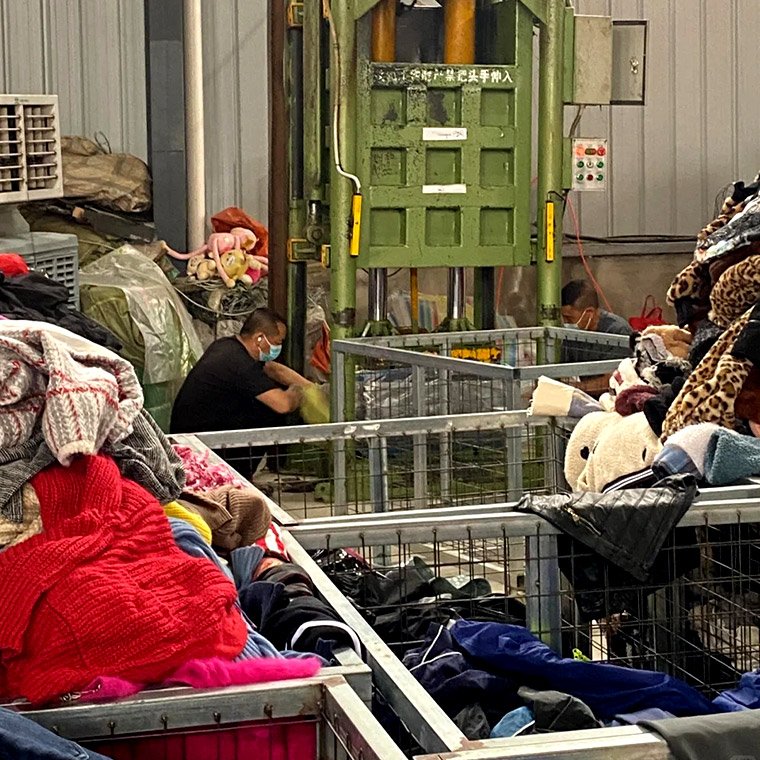 Workers are packing second – hand clothes in the warehouse
