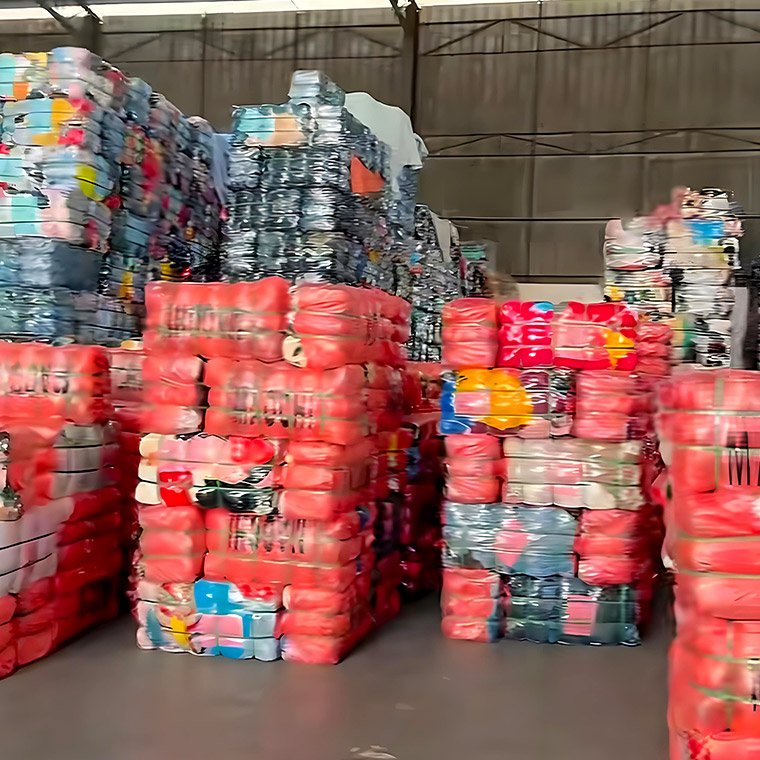 These are the packed second – hand clothes. They are made into square – shaped bundles and compressed very tightly